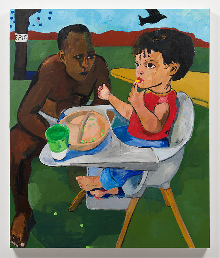 Mother’s birth mother’s bier est un hommage à Untitled, 2022 du peintre américain Henry Taylor présentée ci-dessous. Anaïs Benguigui propose une interprétation personnelle de cette composition en abordant la question du point de vue de la mère. Cette peinture aborde la question de la défusion dans le post-partum, entre volonté de contrôle et de lâcher prise, cette peinture explore les contradictions d’un moment de passage, celui du devenir mère. À l’image de sa peinture First meal : oedipe time, 2025, Anaïs Benguigui explore les mouvements internes et ambivalents des mères.